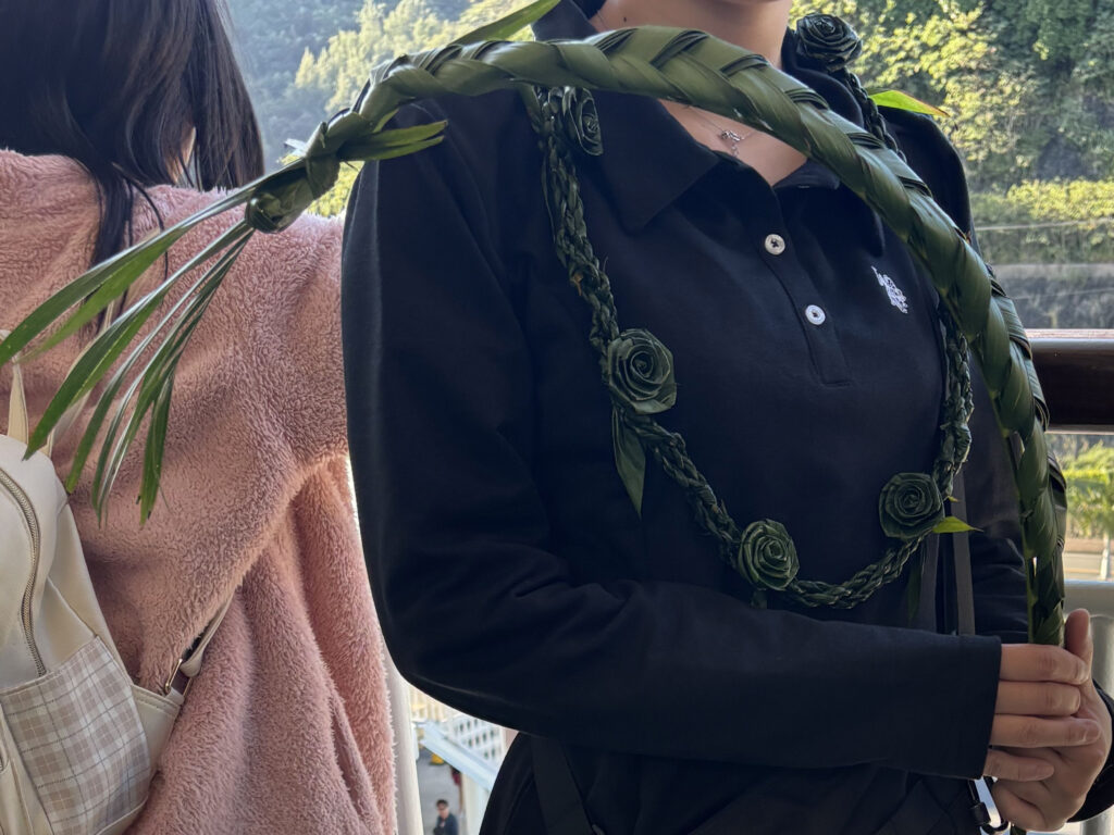 同時に感じたのは、レイ作りは思っていた以上に手間と時間がかかるものだということ。材料を集めて、葉っぱを整えて、ひとつひとつ編んでいく。その時間すべてが、相手のことを想う時間なんだなと気づきました。